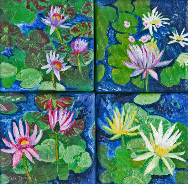 | The Blessing of Waterlilies. A series of 4, each : 10CM X 10CM.. Inspired by my photos. Acrylic. 2010. |